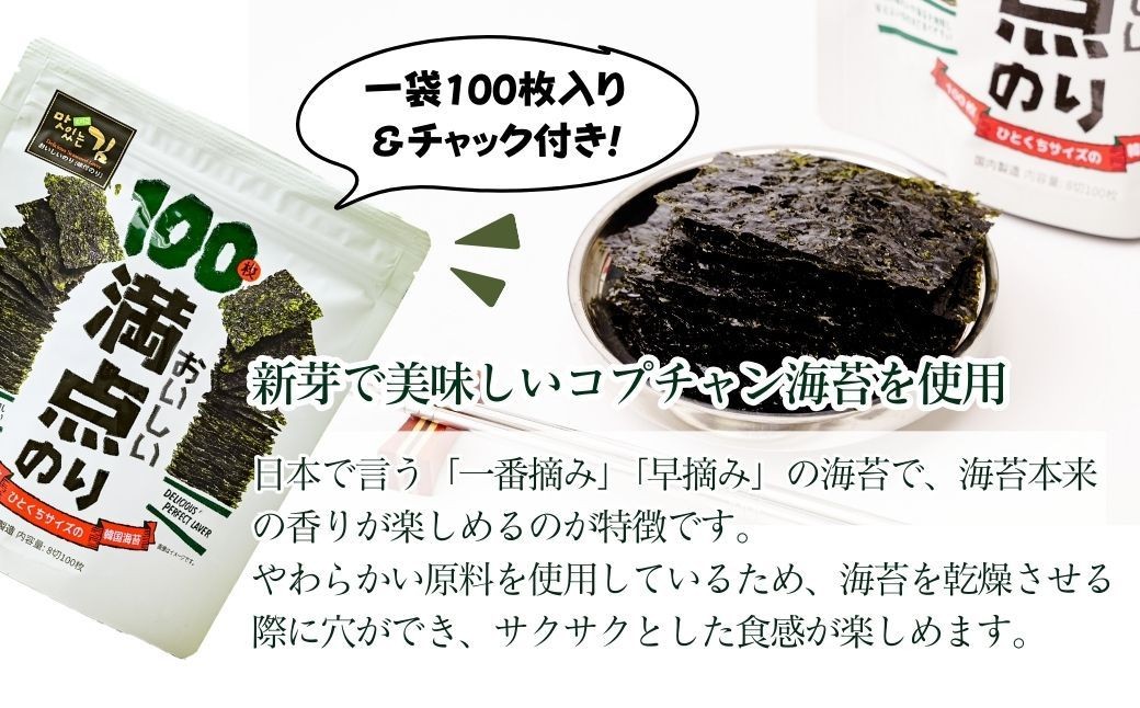 おいしい満点のり (1袋100枚入)<選べる袋数> | 韓国海苔 かんこくのり のり 味付 海苔 美味しい パリパリ ご飯 ごはん 塩 塩加減 塩味 お弁当 味 量 ちょうど良い 丁度良い おとも おにぎり ごま油 家族 リピート おやつ 一口サイズ 食べやすい つまみ ジップ お手軽 サラダ キムチ 何回 国内 本場 ストック おかず 2袋 5袋 シン・インターナショナル 埼玉県 草加市