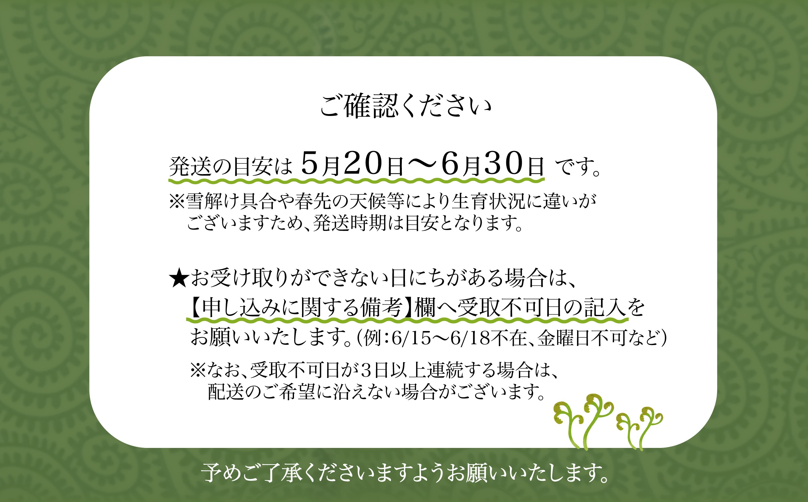 【先行予約・数量限定】採れたて山菜 生わらび 1kg×1束(R8.5月~)