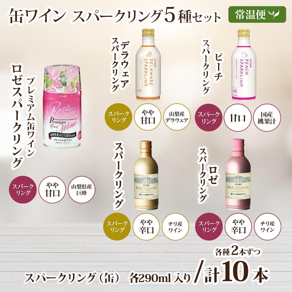 スパークリング 缶ワイン 5種 セット 各290ml×2本 計10本 飲み比べ モンデ酒造 ロゼ デラウェア ピーチ 酒 お酒 贈答 ギフト 晩酌 宅飲み 家飲み キャンプ BBQ バーベキュー パーティー アウトドア 送料無料 山梨県 笛吹市 177-4-173