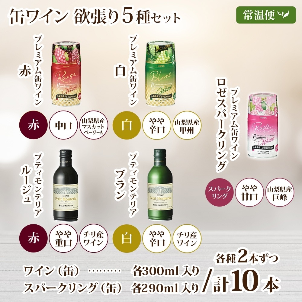 缶ワイン 欲張り 5種 飲み比べ セット 各2本 計10本 飲み比べ モンデ酒造 赤 ロゼ 白 ブラン 酒 お酒 贈答 ギフト 晩酌 宅飲み 家飲み キャンプ BBQ バーベキュー パーティー アウトドア 送料無料 山梨県 笛吹市 177-4-174