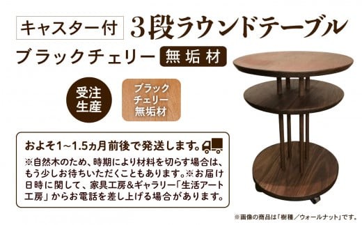 - 【サイドテーブル】 キャスター付き3段ラウンドテーブル ブラックチェリー無垢材 家具 丸テーブル 机 新生活 一人暮らし ひとり暮らし 【生活アート工房】