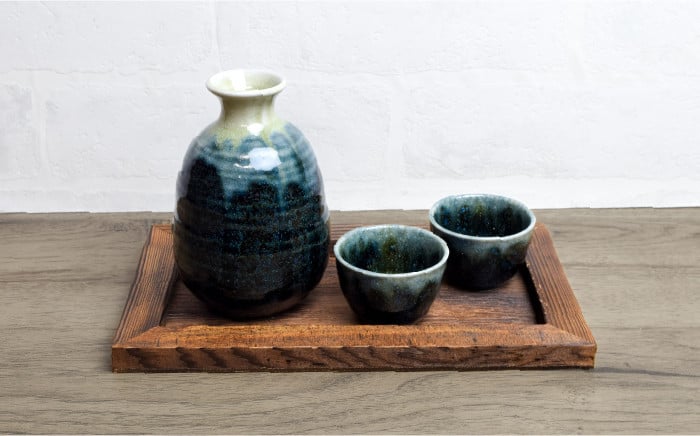 - 【美濃焼】高田焼 釉重ね酒器揃い黒水晶トレー付き【金陶苑】 晩酌 徳利 ぐい吞み [TBX008]