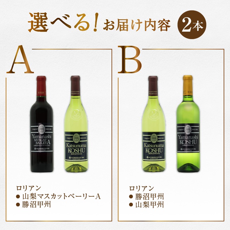 - 【選べる組合せ】ロリアン 2本セット【山梨マスカットベーリーA / 勝沼甲州 / 山梨甲州 】(MG)【ワイン 白百合醸造 赤ワイン 白ワイン 甲州市 山梨県】