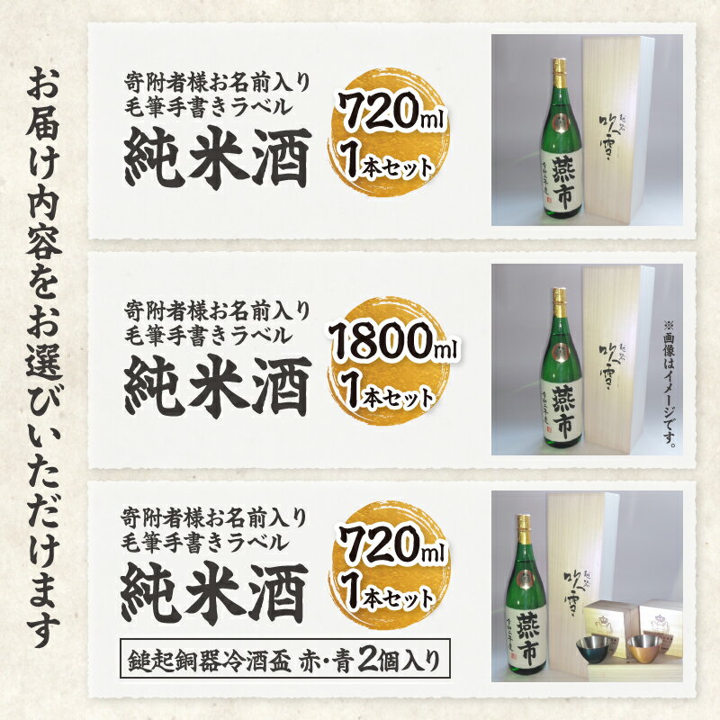【ふるさと納税】 寄附者様名前入り毛筆手書きラベル 純米酒 選べる お届け内容 720ml 1800ml 酒盃2個セット【 名入れ オリジナルラベル 純米酒 国産米 地酒 日本酒 お酒 酒 鎚起銅器冷酒盃 赤青 お取り寄せ 記念 お祝い 酒遊館 辰藏 新潟県 燕市 燕三条 】