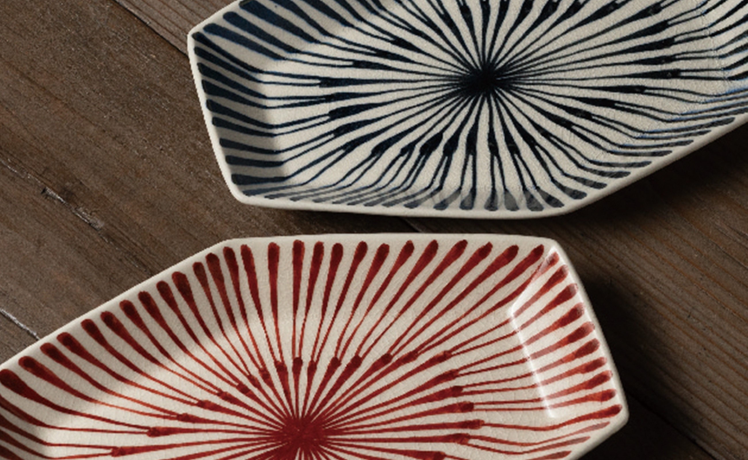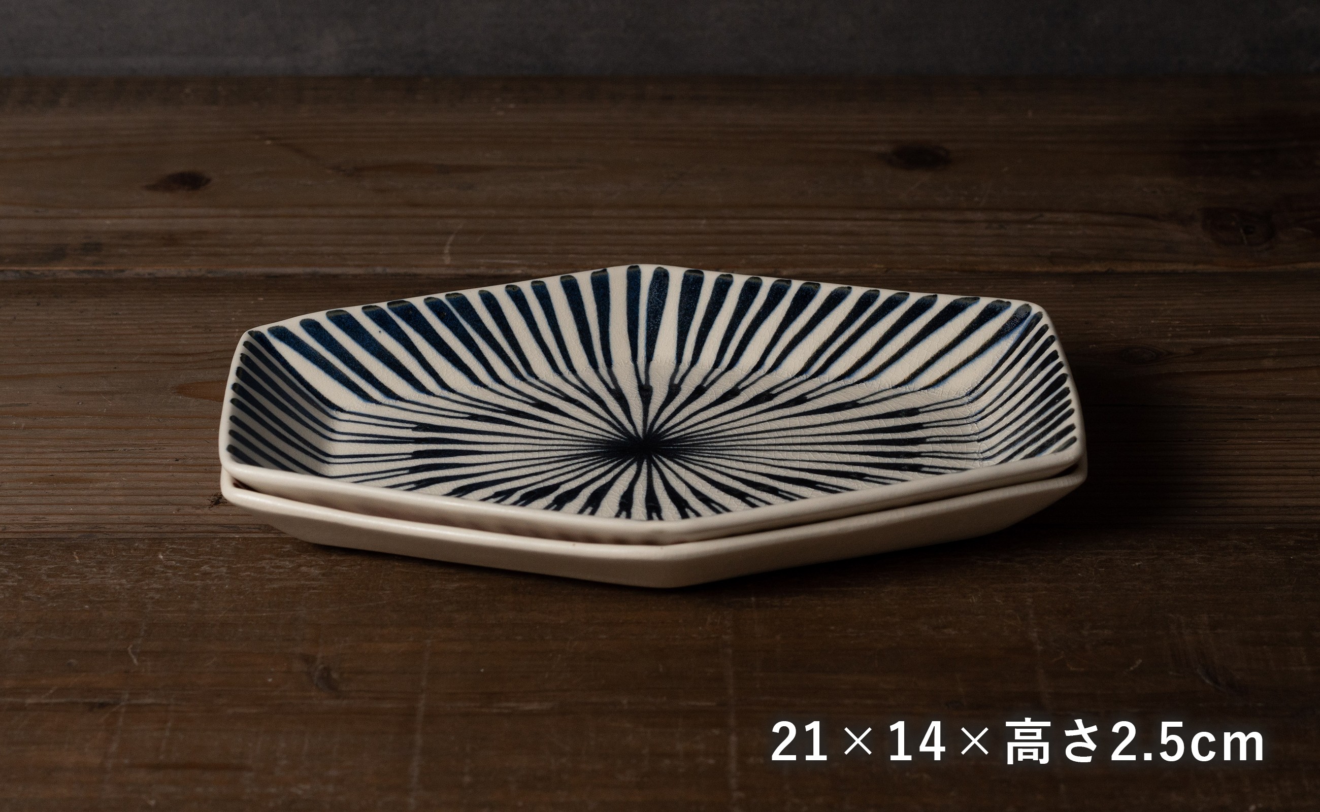- 【セット】 有田焼 手描き 染付 重ね十草 たたら六角中皿 2枚セット (赤・青) 喜鶴製陶