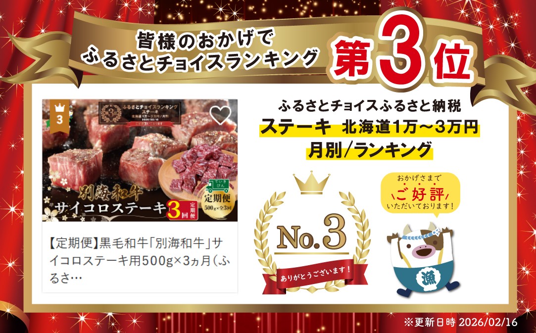 - ランキング第3位獲得!【定期便】黒毛和牛「別海和牛」サイコロステーキ用500g×3ヵ月(ふるさと納税 ステーキ ふるさと納税 肉 ふるさと納税 牛肉 こだわり ふるさと納税 赤身 ふるさと納税 牛 ふるさと納税 赤身肉 ふるさと納税 黒毛和牛 ふるさとチョイス ふるさと納税 仕組み キャンペーン 限度額 計算 ランキング やり方 シミュレーション チョイス チョイスマイル 肉 牛肉 定期便 )