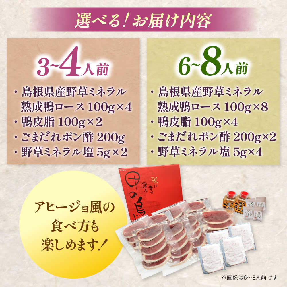 - 【ふるさと納税】【選べる容量】焼肉 TVで紹介されました!島根県産野草ミネラル熟成鴨の焼肉セット(3〜8人前) 鴨鍋 鴨肉 焼肉 しゃぶしゃぶ 人気 おすすめ 肉 お肉 島根県雲南市/鴨専門店カナール[AIDC001]