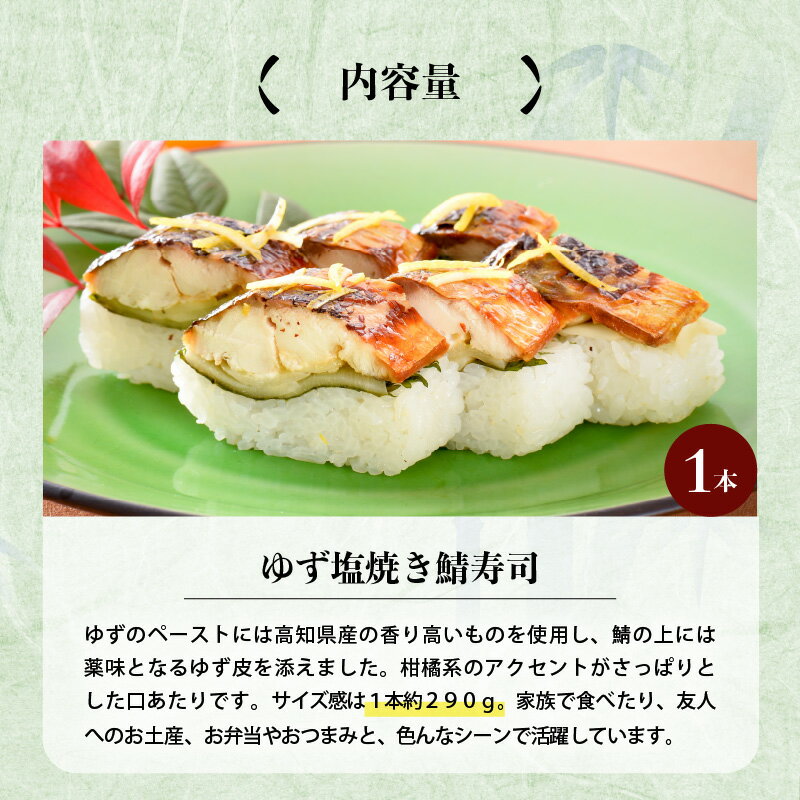 【ふるさと納税】ゆずの薫りが楽しめる 「ゆず塩 焼き鯖寿司」 1本 約290g 〜家族が喜ぶ手土産〜【名物 ジューシー 焼きさば 押し寿司 さば寿司 すし こしひかり 柚 ユズ 柑橘 贈答 ギフト お土産】