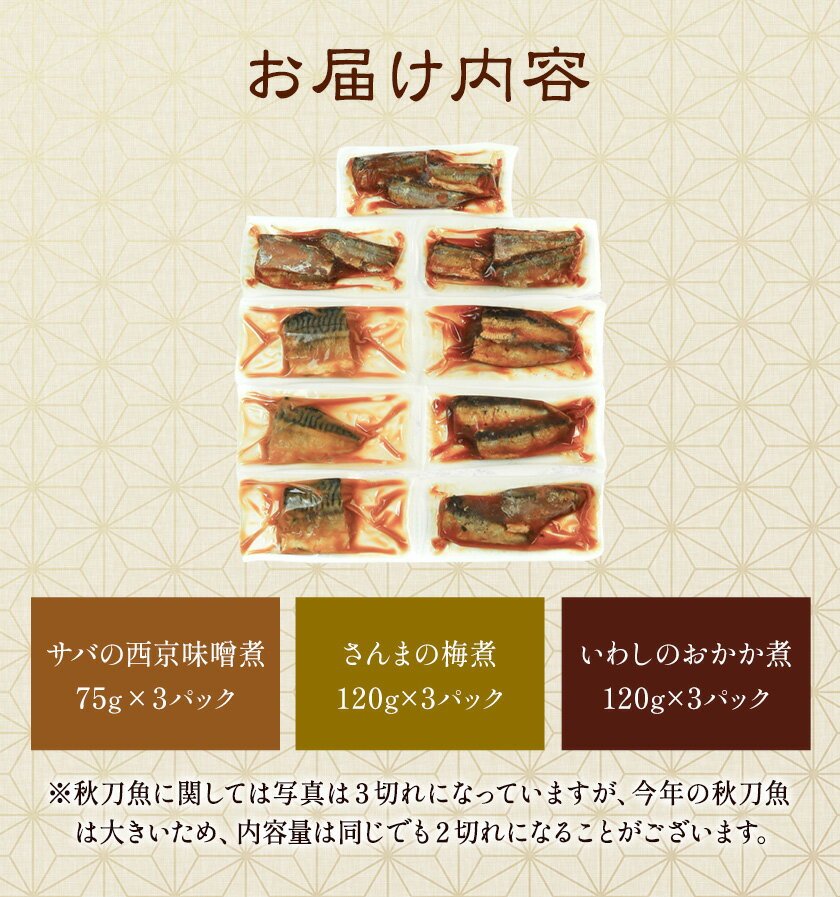 - 【ふるさと納税】賛否両論 笠原さんの 骨までやわらか 煮魚 セット サバの西京味噌煮 75g×3 さんまの梅煮 120g×3 いわしのおかか煮 120g×3 株式会社風土食房《30日以内に出荷予定(土日祝除く)》千葉県 我孫子市 サバ さんま いわし おつまみ お弁当 ごはんのおかず 煮魚