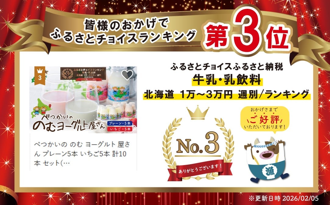 ランキング第3位獲得!べつかいの のむ ヨーグルト 屋さん プレーン5本 いちご5本 計10本 セット( ふるさとチョイス ふるさと納税 仕組み キャンペーン 限度額 計算 ランキング やり方 シミュレーション チョイス チョイスマイル )