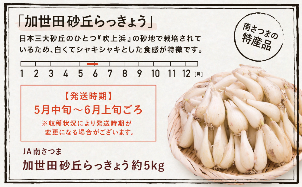◆5月中旬発送開始◆【鹿児島県南さつま市産】加世田砂丘らっきょう 約5kg ◆5月中旬出荷開始 ・ 数量限定 ・ 期間限定 ◆ 先行受付 先行予約 生鮮 らっきょう 砂丘らっきょう 大玉 ラッキョウ サラダ 天ぷら かき揚げ 酢味噌 塩らっきょう 薬味 タルタルソース 生食 漬物 漬け物 特産品 野菜 旬 期間限定 季節の野菜 季節限定 新鮮 鹿児島県産 JA JA南さつま 鹿児島県 南さつま市