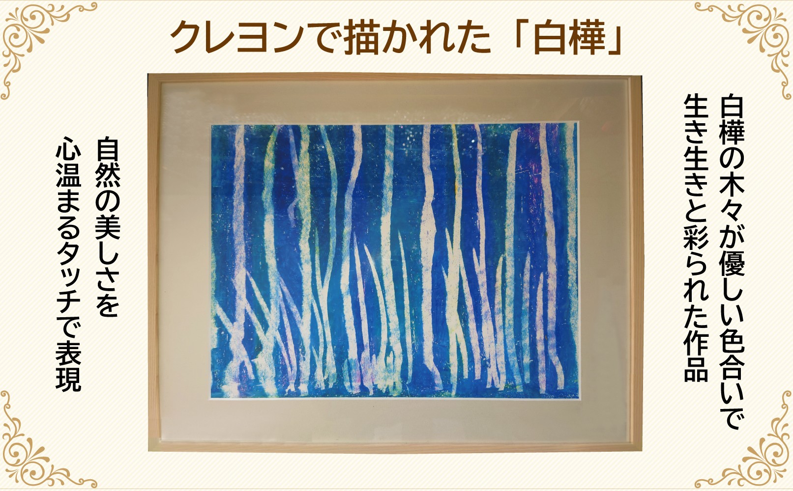 - 【一点もの】原画作品「白樺」アート作品 インテリア 絵画 しらかば 風景 絵 クレヨン画 壁掛け 額装 福祉 送料無料 就労継続支援B型 ふくちゃん 福島県 新地町