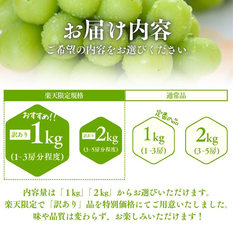 【ふるさと納税】*楽天限定* 『選べる規格! シャインマスカット 』約1kg〜約2kg・ 訳あり約1kg〜訳あり約2kg / 9月下旬~11月頃 配送予定 // ふるさと納税 訳あり シャイン マスカット ぶどう ブドウ 葡萄 フルーツ 果物 くだもの 人気 プレゼント 長野 ふるさと納税