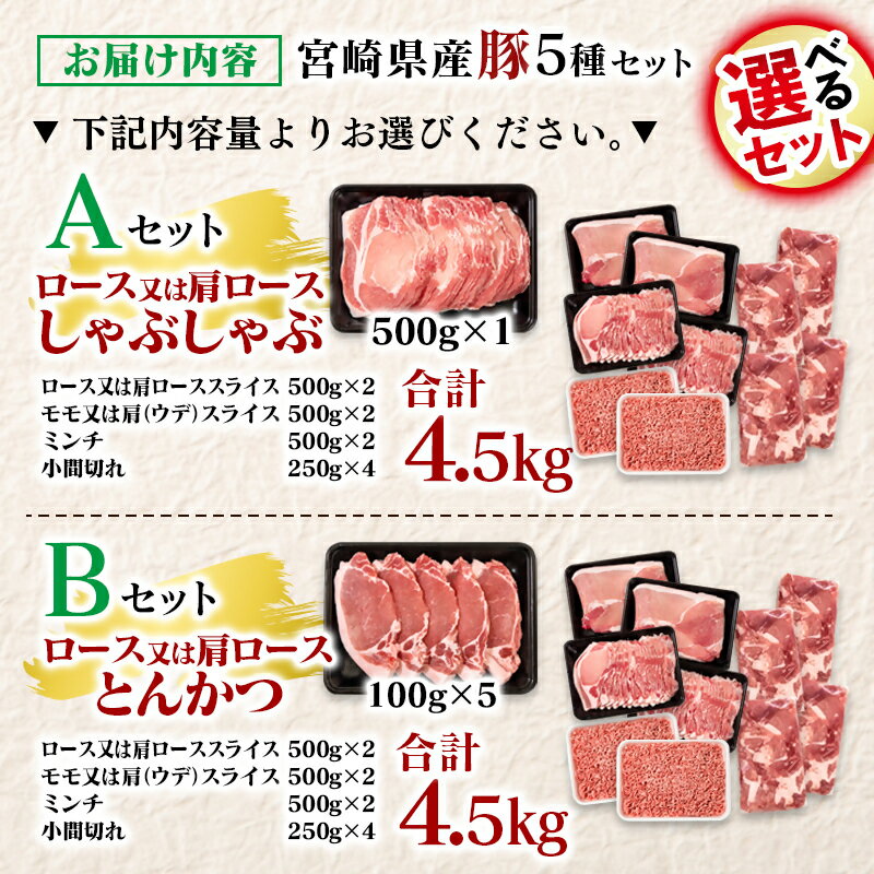 - 【ふるさと納税】宮崎県産豚肉5種 満載セット4.5kg 選べる内容(Aしゃぶしゃぶ用・Bとんかつ用)「数量限定」 宮崎県 西都市 国産 小分け YA ☆<58-53a><58-54a>