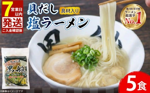 【スピード発送】 貝だし塩ラーメン 5食 ベビーホタテ スープ チャーシュー メンマ 具材入り 真空 冷凍 惣菜 黒船 テレビ TV 放送 ニュース 震災 火災 被災 支援 番組 大船渡 大船渡市 三陸 岩手県
