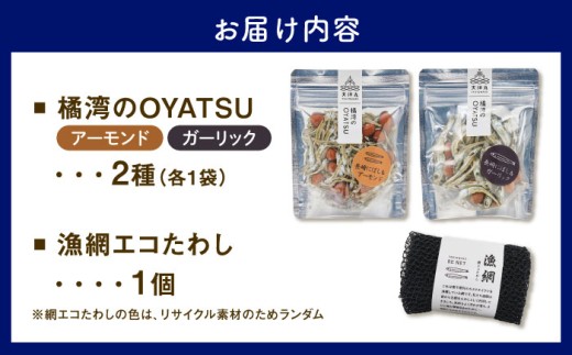 - 橘湾のOYATSU(アーモンド・ガーリック)と漁網エコたわしセット 長崎県/株式会社天洋丸 [42ALAC012] 煮干し いりこ イリコ カルシウム 魚介 スナック 菓子 おつまみ アーモンド ガーリック 健康 SDGs アップサイクル リサイクル エコ キッチン用品 たわし スポンジ