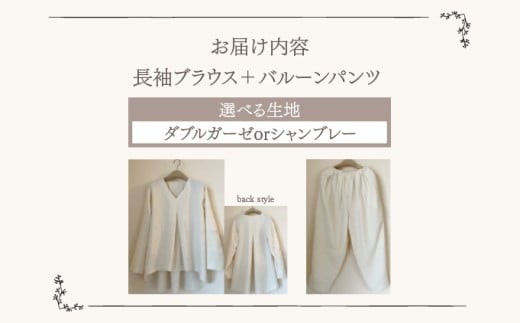 - 生地が選べる!人と環境にやさしい天然素材のルームウエア(長袖ブラウス+バルーンパンツ) ダブルガーゼorシャンブレー SK007/SK008