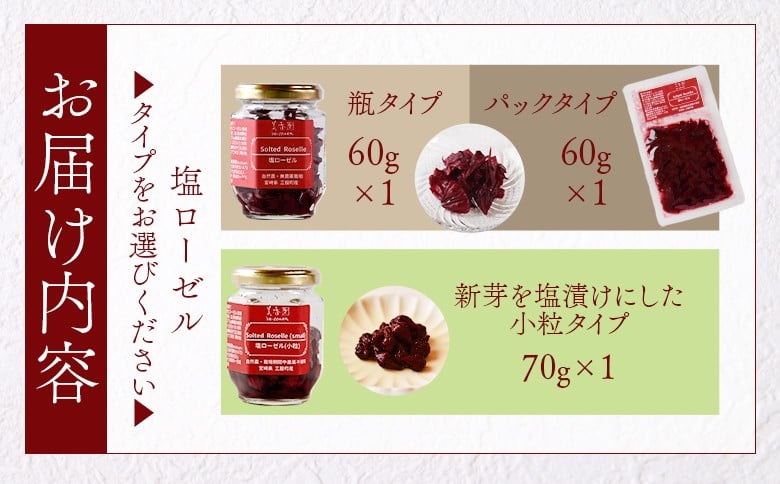 - 選べるタイプ<塩ローゼル 【瓶/パック】 60g/【小粒】70g> 国産ハーブ 香りや風味が豊か しそ風味 梅風味 混ぜご飯 箸休め 薬味 漬物 和食 和風 おにぎりの具 ごはん ご飯 パン パスタ サラダ 調味料 塩漬け 宮崎県 三股町【MI624-bi_oya】【美香園】