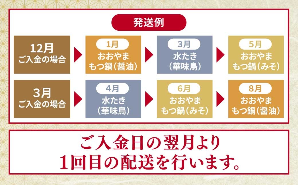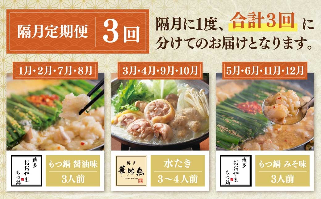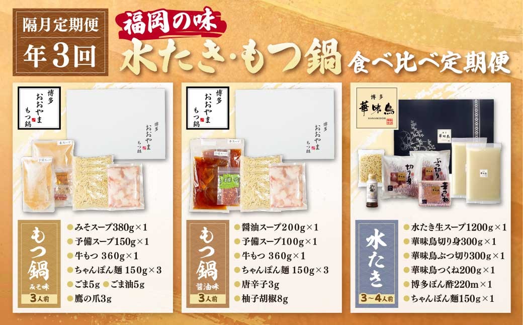 - 選べる!福岡の味水炊き・もつ鍋食べ比べ定期便【隔月定期便(年6回 / 3回発送)】 おおやま もつ鍋 醤油 しょうゆ 味噌 みそ 華味鳥 水炊き 定期便 福岡 人気 国産 福智町 人気 おすすめ W08 ★レビューキャンペーン開催★