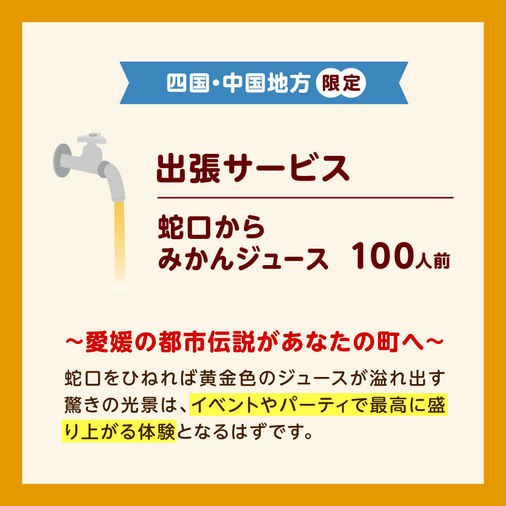 【ふるさと納税】みかんジュース 蛇口からみかんジュース100人前(四国・中国地方限定) / オレンジジュース 100% みかん ジュース ストレート 果汁 移動販売 イベント設営 / 愛媛県砥部町/えひめ農園組合[BJAZ010]