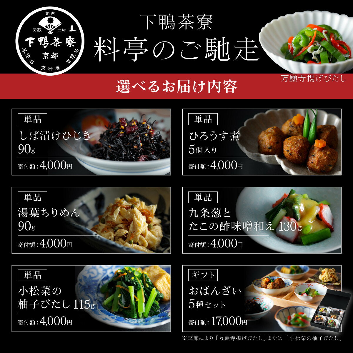 - 【ふるさと納税】【下鴨茶寮】料亭のおばんざい 選べる4種|京都 老舗料亭 名店 おばんざい 人気 [ 料亭仕込み しば漬けひじき 九条葱とタコの酢の物 湯葉ちりめん ひろうす煮 小松菜の柚子びたし 贅沢 グルメ 美食 お取り寄せ 通販 送料無料 ふるさと納税 ]