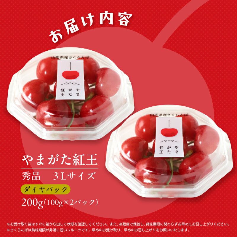 - 【ふるさと納税】【先行予約】 令和8年産 さくらんぼ やまがた紅王 3Lサイズ 秀品 200g (100g×2パック) ダイヤパック 2026産 山形県産【2026年6月中旬頃〜6月下旬頃発送予定】※配送不可 沖縄・離島フルーツ 果物 果実 山形産 直送 お取り寄せ
