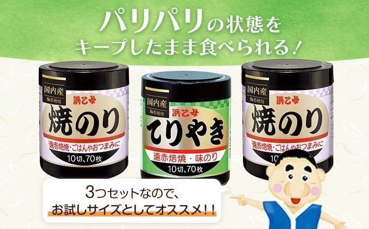 海苔 国産海苔使用 焼きのり(10切70枚×2個) 味のりてりやき (10切70枚×1個) 海苔 210枚 浜乙女《30日以内に出荷予定(土日祝除く)》三重県 東員町 ギフト 贈答 プレゼント 贈り物 国産 ご飯のお供 ごはんのお供 白米 おつまみ 寿司