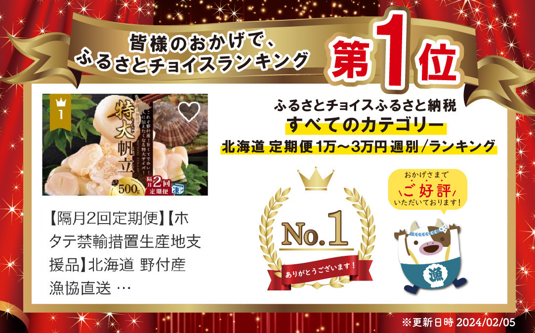 【隔月2回定期便】ホタテ の中の ほたて 野付漁協自ら加工だから 旨さ 訳あり ホタテ 野付産 冷凍 ホタテ 500g 特大 ( 貝柱 ほたて ホタテ 北海道 別海町 帆立 大 海鮮 特大 訳あり ふるさとチョイス ふるさと納税 仕組み キャンペーン 限度額 計算 ランキング やり方 シミュレーション チョイスマイル 大容量 )
