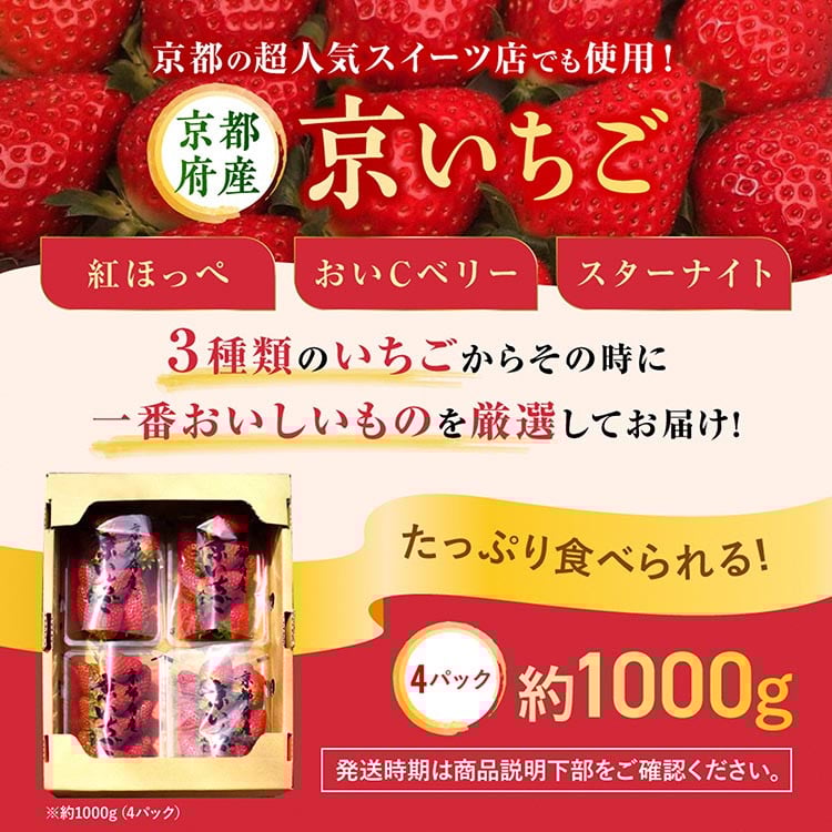 - いちご 完熟 朝採れ 約1,000g(250g 4パック) 小島農園 紅ほっぺ おいCベリー スターナイト から厳選してお届け ≪期間限定 数量限定 高級いちご 苺 イチゴ 京いちご ギフト 贈答 旬 フルーツ 果物 くだもの 春 人気いちご おすすめいちご ichigo strawberry itigo≫※離島への配送不可 ※2026年1月中旬~5月上旬頃に順次発送予定