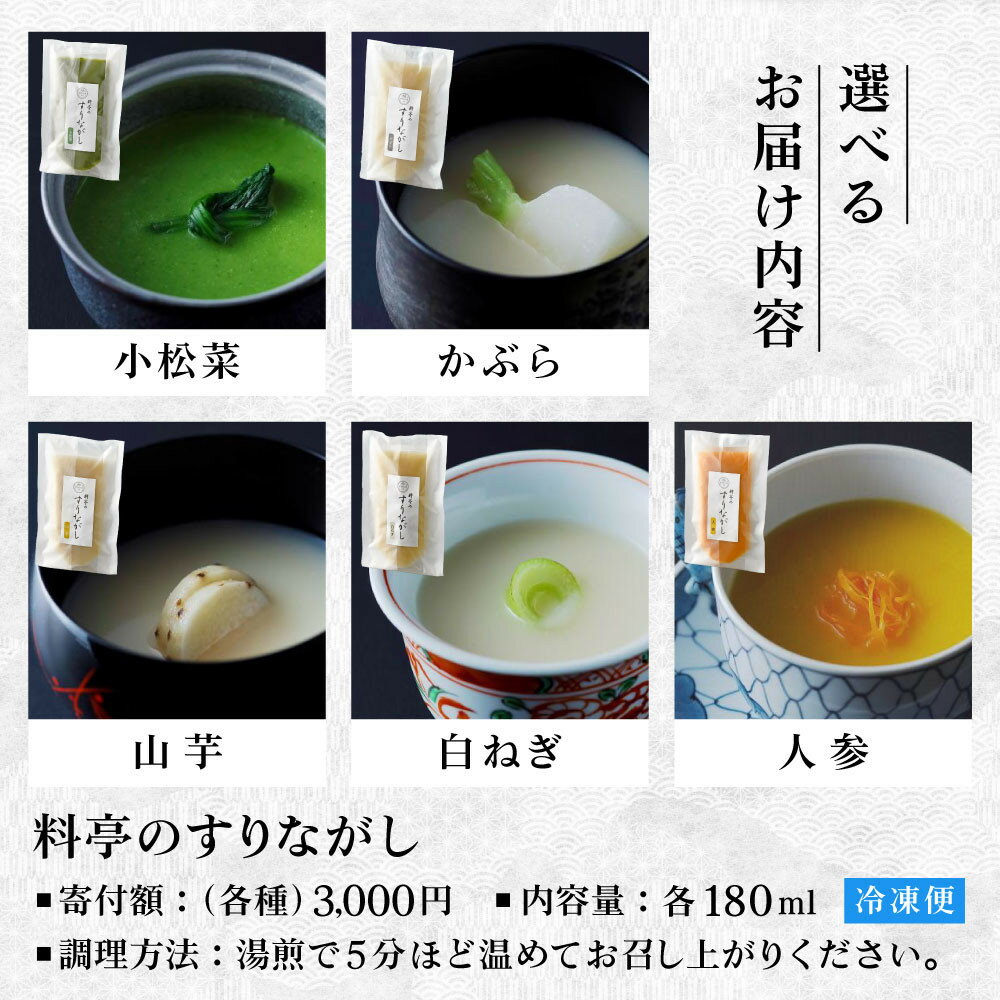 - 【ふるさと納税】【下鴨茶寮】料亭のすりながし 選べる5種|京都 老舗料亭 名店 伝統料理 人気 [ 料亭仕込みのすりながし 小松菜 山芋 人参 白ねぎ かぶら 贅沢 グルメ 美食 和食 日本料理 京料理 お取り寄せ 通販 送料無料 ふるさと納税 ]