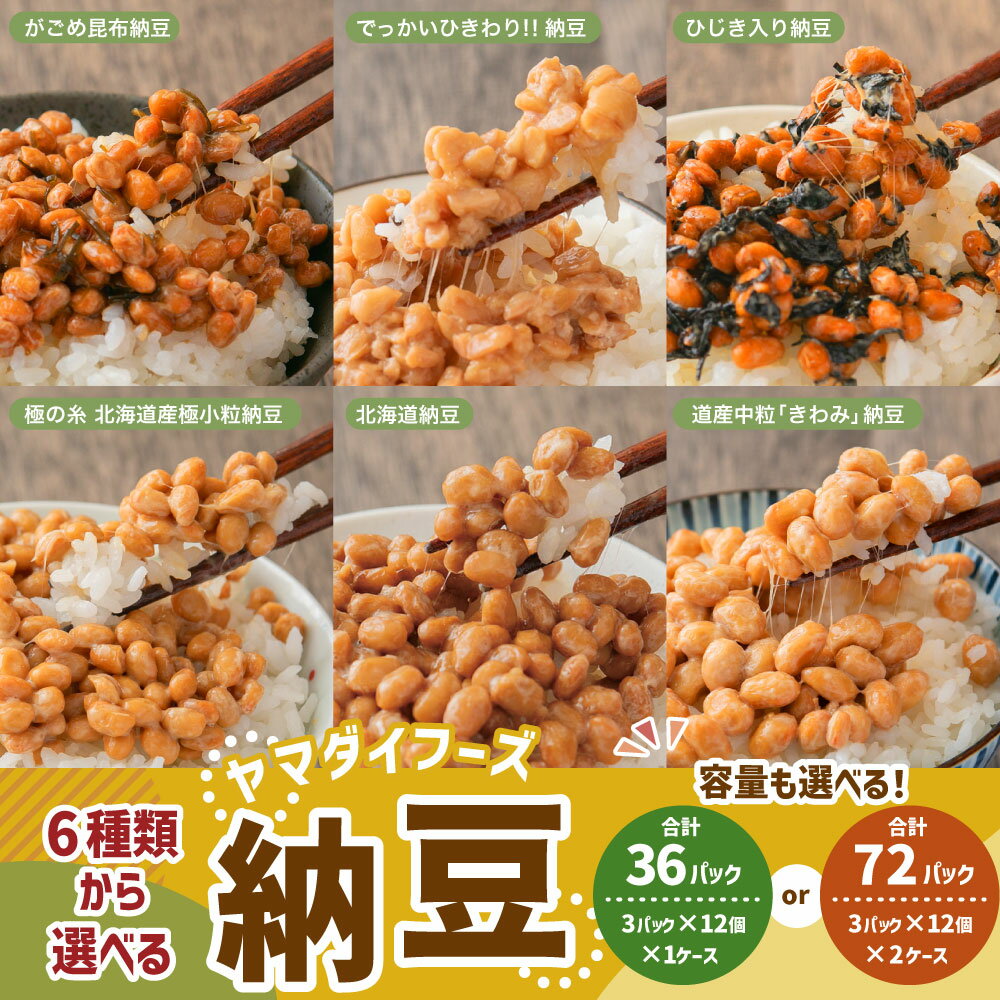 - 【ふるさと納税】<種類と容量が選べる>ヤマダイフーズ 納豆 6種 (がごめ昆布/でっかいひきわり/ひじき入り/北海道納豆/極の糸 北海道産極小粒/道産中粒「きわみ」) 3パック×12個 各1ケース or 各2ケース 大豆 発酵食品 小樽市 北海道 【決済より7日程度で発送】