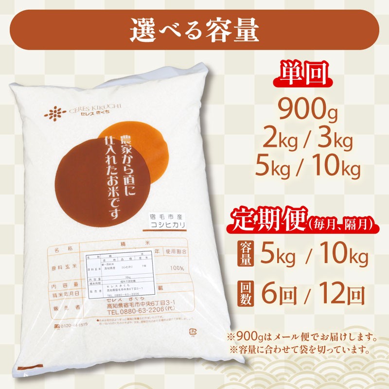 - 【選べる容量】令和7年産 米 コシヒカリ 定期便 900g 2kg 3kg 5kg 10kg 12回 6回 毎月発送 隔月発送 スピード発送 7日以内発送 2025年産 おこめ 精米 R7 一人暮らし お試し 国産 産地直送 ご飯 ごはん 送料無料 白米 こめ コメ 贈答 ギフト プレゼント ふるさと納税 ふるさと 宿毛市 高知県