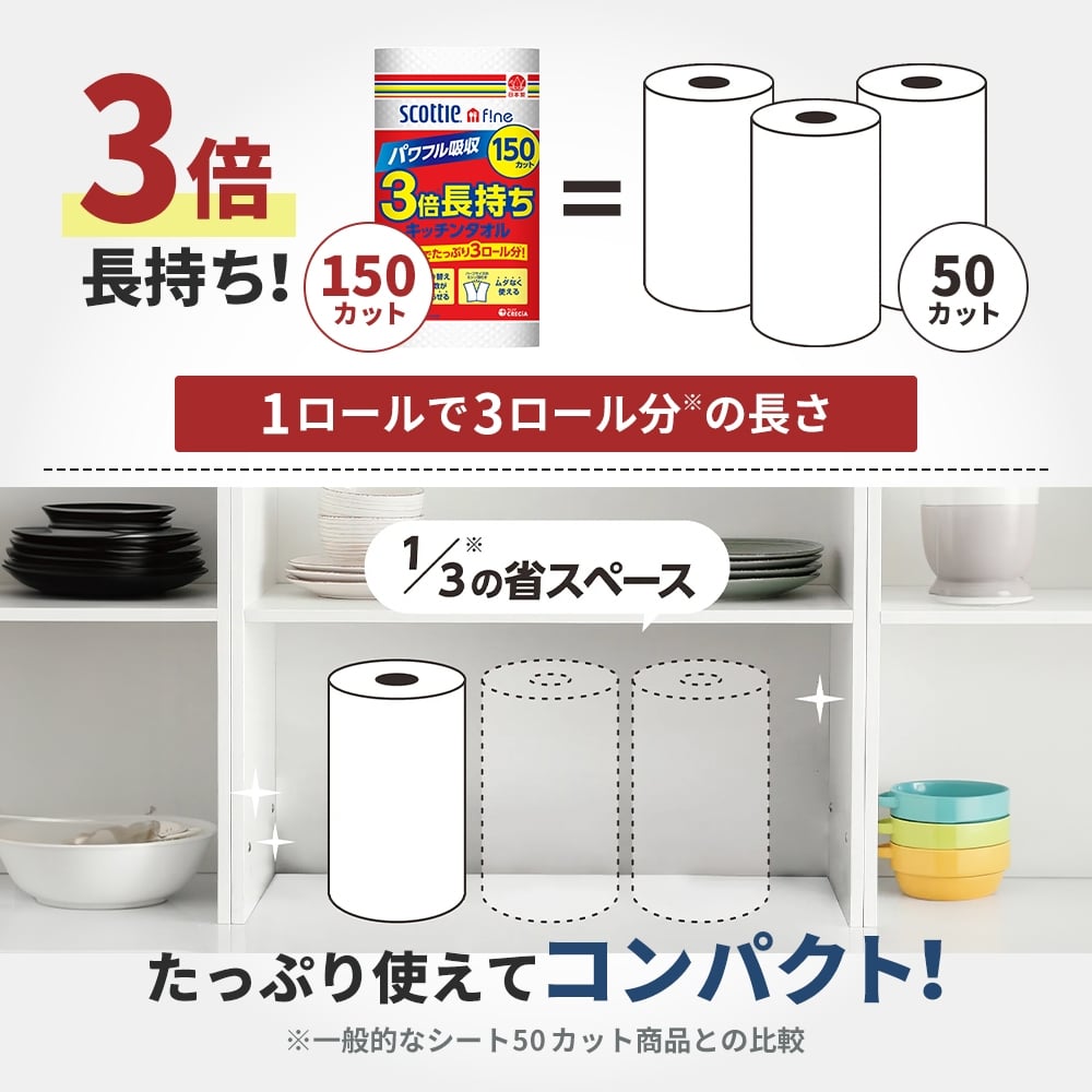 キッチンペーパー 6パック入 スコッティ ファイン 1ロール 3倍 150カット トイレットペーパー シングル フラワーパック 24ロール (4ロール × 6パック)[№5704-1774]