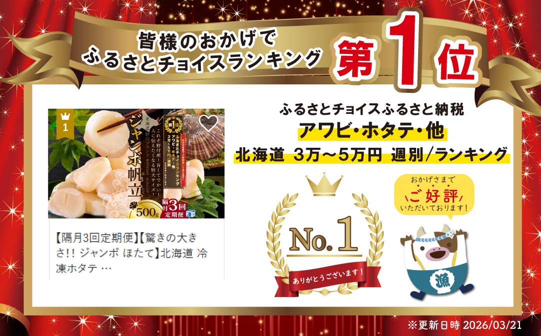 - 御礼!ランキング第1位獲得!【隔月3回定期便】【驚きの大きさ!! ジャンボ ほたて】北海道 冷凍ホタテ 貝柱 ジャンボホタテ500g ( 北海道 野付 ほたて ホタテ 帆立 貝柱 人気 特大 大玉 大 訳あり ふるさとチョイス 仕組み キャンペーン 限度額 計算 ランキング やり方 シミュレーション チョイス チョイスマイル 大容量 )