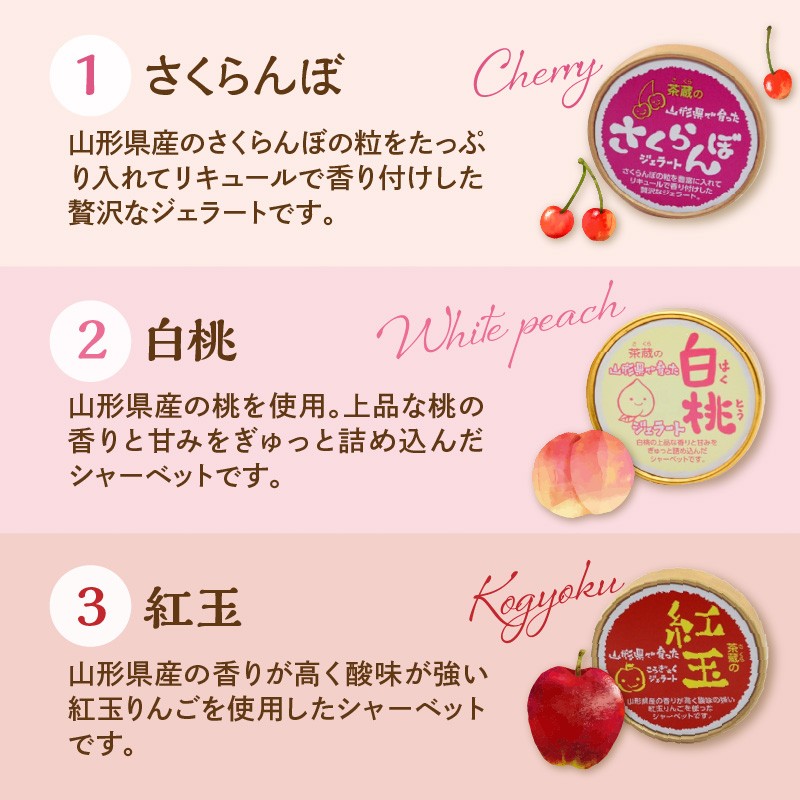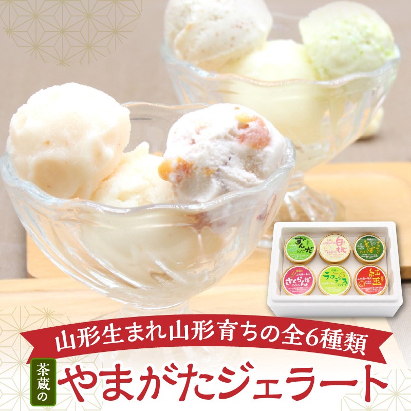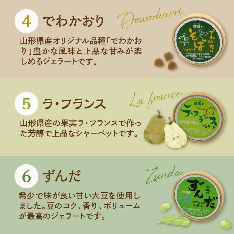 - 茶蔵 の やまがた ジェラート 6個 詰合せ ( 1個 120ml ) 山形県産 果物 さくらんぼ ラ・フランス ずんだ 枝豆 紅玉 りんご 白桃 でわかおり そば 使用 アイス 山形県 米沢市