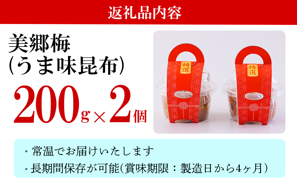 - 南高梅 梅干し 美郷梅 昆布 200g×2 3Lサイズ 塩分控えめ A級品 [農林産物直売所 美郷ノ蔵 宮崎県 美郷町 31ab0109] 国産 宮崎県産 美郷産 常温 送料無料 贈答品 父の日 母の日 プレゼント ギフト おやつ お菓子 料理 調理 おかず