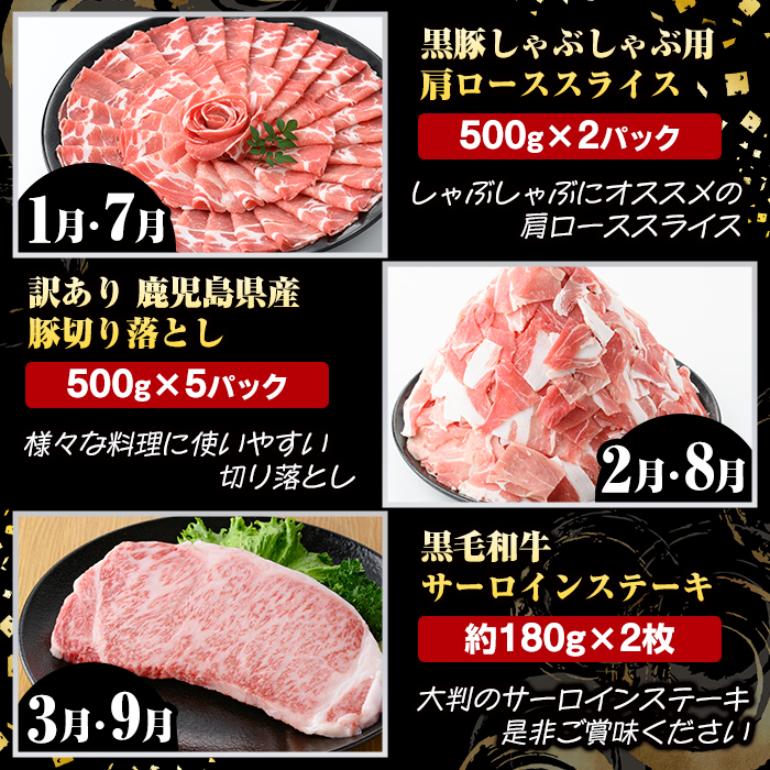 <定期便・全12回(連続)>鹿児島県産 牛肉・豚肉 詰め合わせ (総量13.7kg以上) 国産 鹿児島県産 黒豚 しゃぶしゃぶ 肩 ロース スライス 訳あり 切り落とし 黒毛和牛 サーロイン ステーキ 黒豚 バラ 経産牛 カタ ウデ 小分け セット 【スターゼン】akn042-34