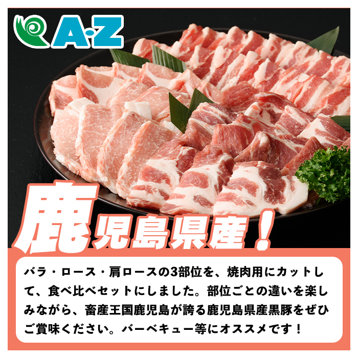- 鹿児島県産 黒豚 焼肉セット(合計900g・各300g×3種) 国産 九州産 鹿児島産 豚肉 黒豚 バラ ロース 肩ロース 焼き肉 BBQ 食べ比べ 詰め合わせ 小分け 【株式会社マキオ】akn068-02