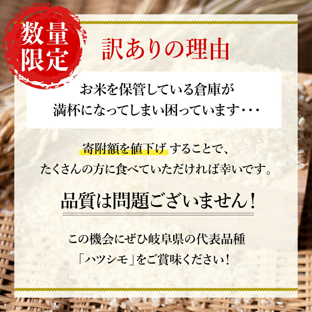 - 【ふるさと納税】【30kg 今だけ寄付額46,000円/在庫なくなり次第終了】令和7年産 ハツシモ米【 玄米 】30kg 【岐阜県代表品種】訳あり 期間限定 数量限定 寄付額改定/世界農業遺産認定地域(清流長良川中流域)で栽培! 大量 大容量 L6 G30-08