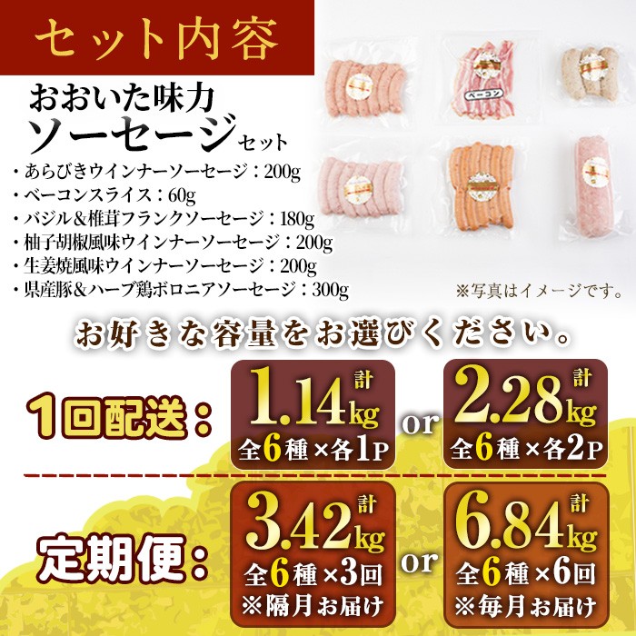 <内容量・お届け回数が選べる!>おおいた 味力 ソーセージセット(総量1.14kg~6.84kg) ウィンナー ベーコン 定期便 国産 冷凍 豚肉 鳥肉 詰め合わせ 惣菜 おかず お弁当 粗挽き あらびき 大分県 佐伯市【DP68・DP69・DP79・DP80】【まるひで】