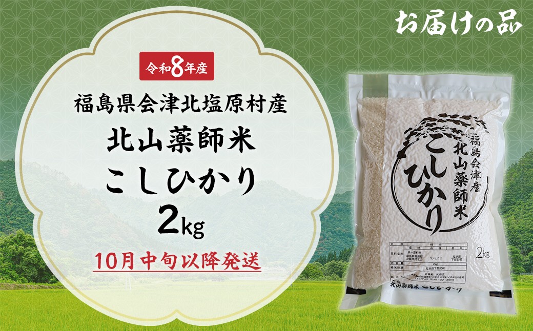 - 【先行予約/令和8年産 新米】【選べる配送回数】福島会津産・北山薬師米こしひかり2kg(200m高地栽培) 【 ふるさと納税 人気 おすすめ 白米 精米 銘柄米 ブランド米 コシヒカリ 米 2kg 国産 定期便 福島 会津 裏磐梯 北塩原 送料無料 】 KBAG007-v