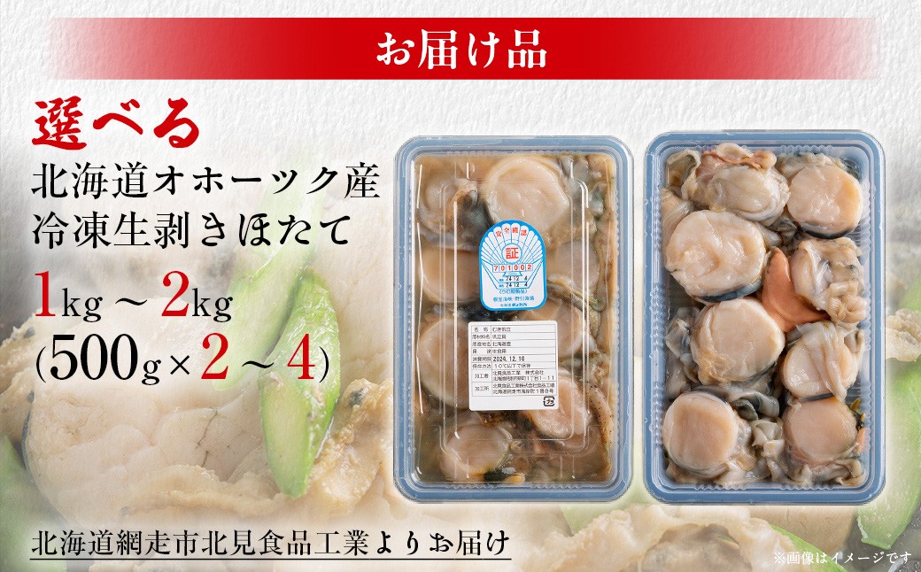 - 冷凍生剥きほたて 選べる 1kg ~ 2kg【 ふるさと納税 人気 おすすめ ランキング ホタテ ほたて ホタテ 剥き 生剥き 帆立 貝柱 貝ひも 北海道産 天然 冷凍 貝類 ギフト 贈答 贈り物 自宅用 家庭用 オホーツク 北海道 網走市 送料無料 】 ABAE009
