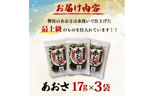 【志摩産あおさ】 17g × 3袋 新物 乾燥 国産 アオサ 青さ 海藻 食物繊維 海苔 あおさ海苔 海産物 味噌汁 みそ汁 具材 朝 ご飯 朝食 夕飯 夕食 簡単 お手軽 5000円 【 三重県 】[ 伊勢志摩 ]