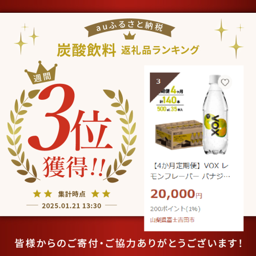- 【4か月定期便】VOX レモンフレーバー バナジウム 強炭酸水 500ml 35本 【富士吉田市限定カートン】