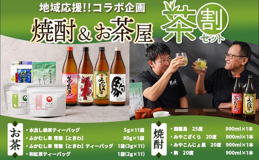 - 焼酎&お茶屋のコラボ!『茶割』セット_AC-22-001_(都城市) コラボ返礼品 焼酎 お茶 食中酒 贈り物 茜霧島 ふかむし茶 和紅茶 みやこざくら みやこんじょ黒 駒 水出し緑茶