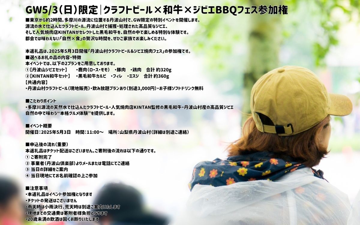 2026年5月3日開催 丹波山村BBQ参加権利 丹波山ジビエセット(約2人前)/ 多摩川源流の美味しいクラフトビールと、丹波山村のジビエが楽しめるBBQフェス参加券【tab0242】