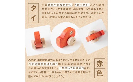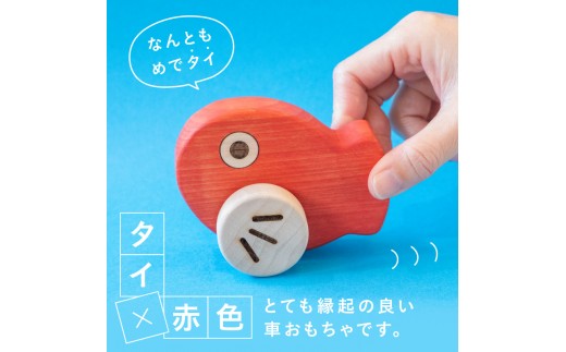- めでタイくるま 玩具 知育玩具 赤ちゃん おもちゃ 車 動く 回る ハイハイ 出産祝い お誕生日 こどもの日 ヒノキ 安全安心 縁起物 木製 国産 プレゼント 贈答 ギフト 福岡県 八女市