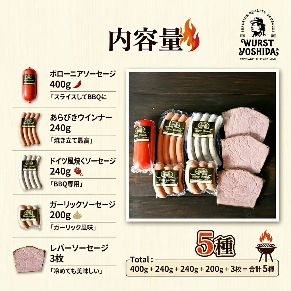 - 【ふるさと納税】ヴルストよしだ BBQ セット 5種 ボローニアソーセージ あらびきウインナー ドイツ風焼くソーセージ ガーリックソーセージ レバーソーセージ 計1,120g以上 IFFA金賞 冷蔵 北海道 新十津川町 【新十津川町】