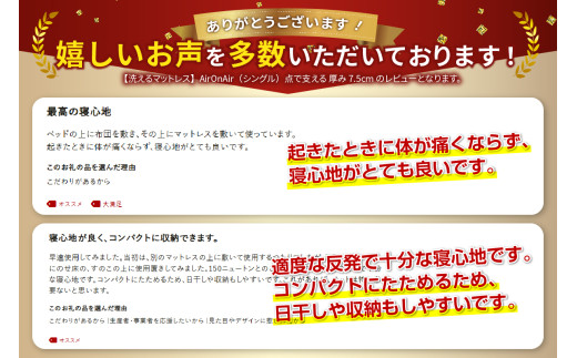 【洗えるマットレス】AirOnAir(シングル)点で支える 厚み7.5cm シングルマット 寝具 シングル マットレス 布団 AirOnAir 洗える 山梨 富士吉田