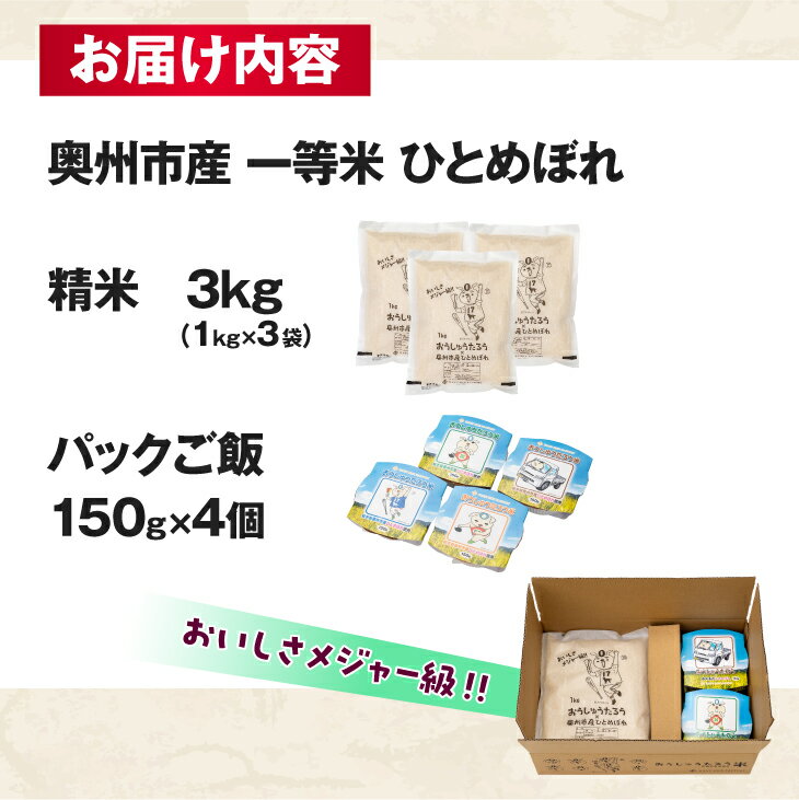 【ふるさと納税】 こだわり農家HARURICE 岩手県奥州市産お米 おうしゅうたろうpackage ひとめぼれ 1kg×3 パックご飯 150g×4セット 一等米 精米 白米 奥州市公式マスコットキャラクター ご当地キャラ ゆるキャラ 常温配送 [CG008]
